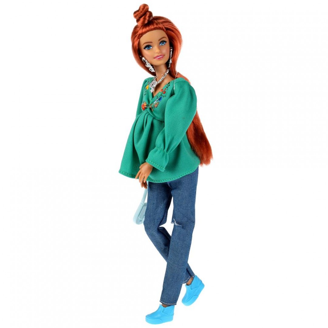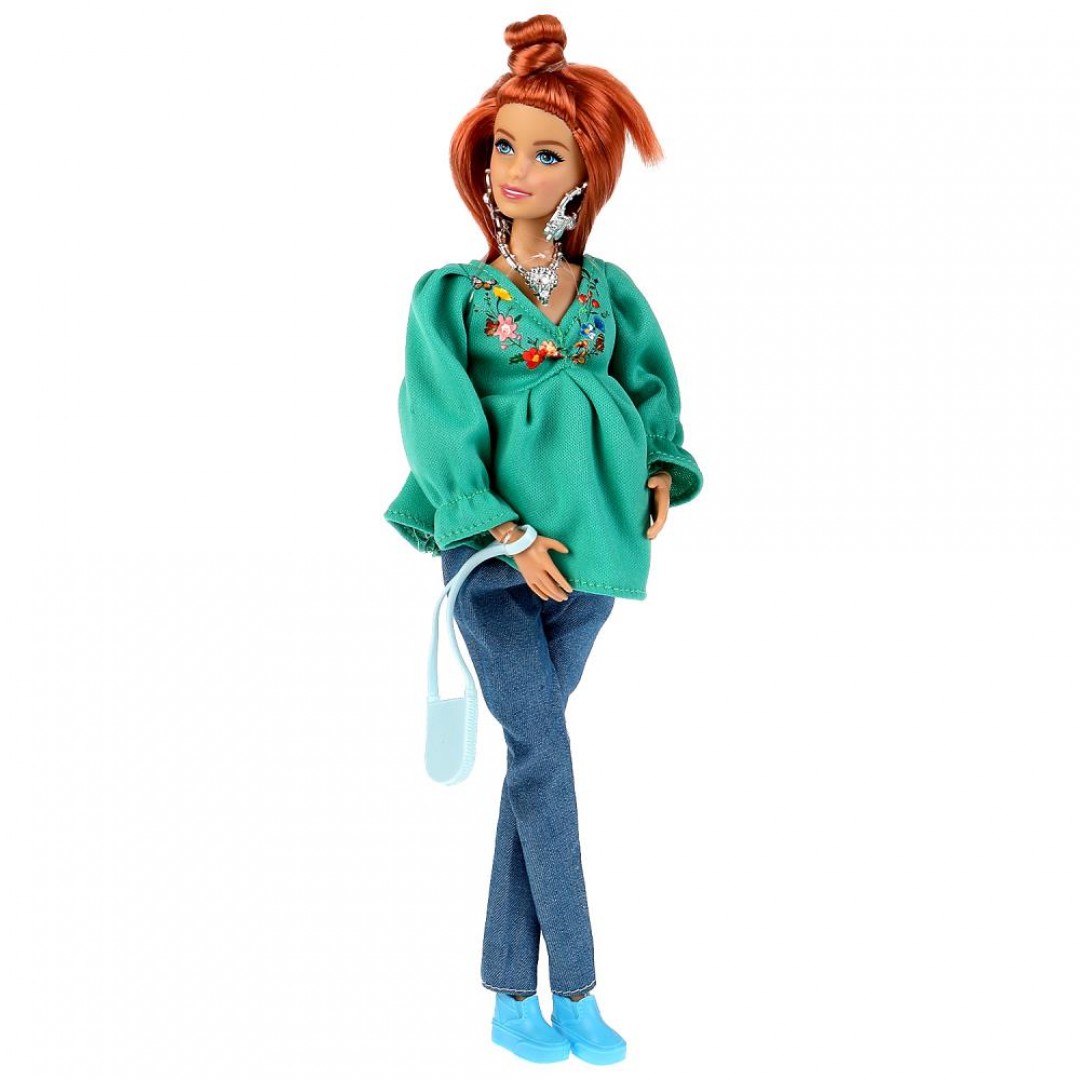 Будущая мама София одета в лёгкую зеленую брюки, с украшенным изображением цветов воротом и удобные брюки. Образ куколки дополняют модные крупные серьги, колье и элегантная сумочка. Одежду и аксессуары легко снять и надеть. С такой модной куклой девочке будет интересно и весело играть: благодаря тому, что руки и ноги куклы подвижны, им можно придать любое положение. У Софии длинные красивые волосы, которые хозяйка куклы сможет заплетать в разные причёски. Детально проработанный дизайн игрушки вдохновит девочку на новые игровые сюжеты.