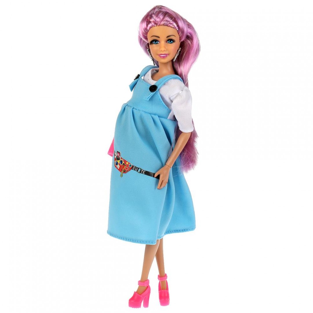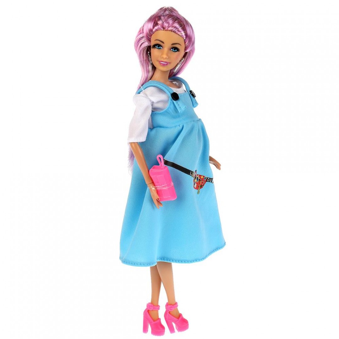 Будущая мама София одета в белую футболку и голубой сарафан. Образ куколки дополняют модные крупные серьги и элегантная сумочка. Одежду и аксессуары легко снять и надеть. С такой модной куклой девочке будет интересно и весело играть: благодаря тому, что руки и ноги куклы подвижны, им можно придать любое положение. У Софии длинные красивые волосы, которые хозяйка куклы сможет заплетать в разные причёски. Детально проработанный дизайн игрушки вдохновит девочку на новые игровые сюжеты.