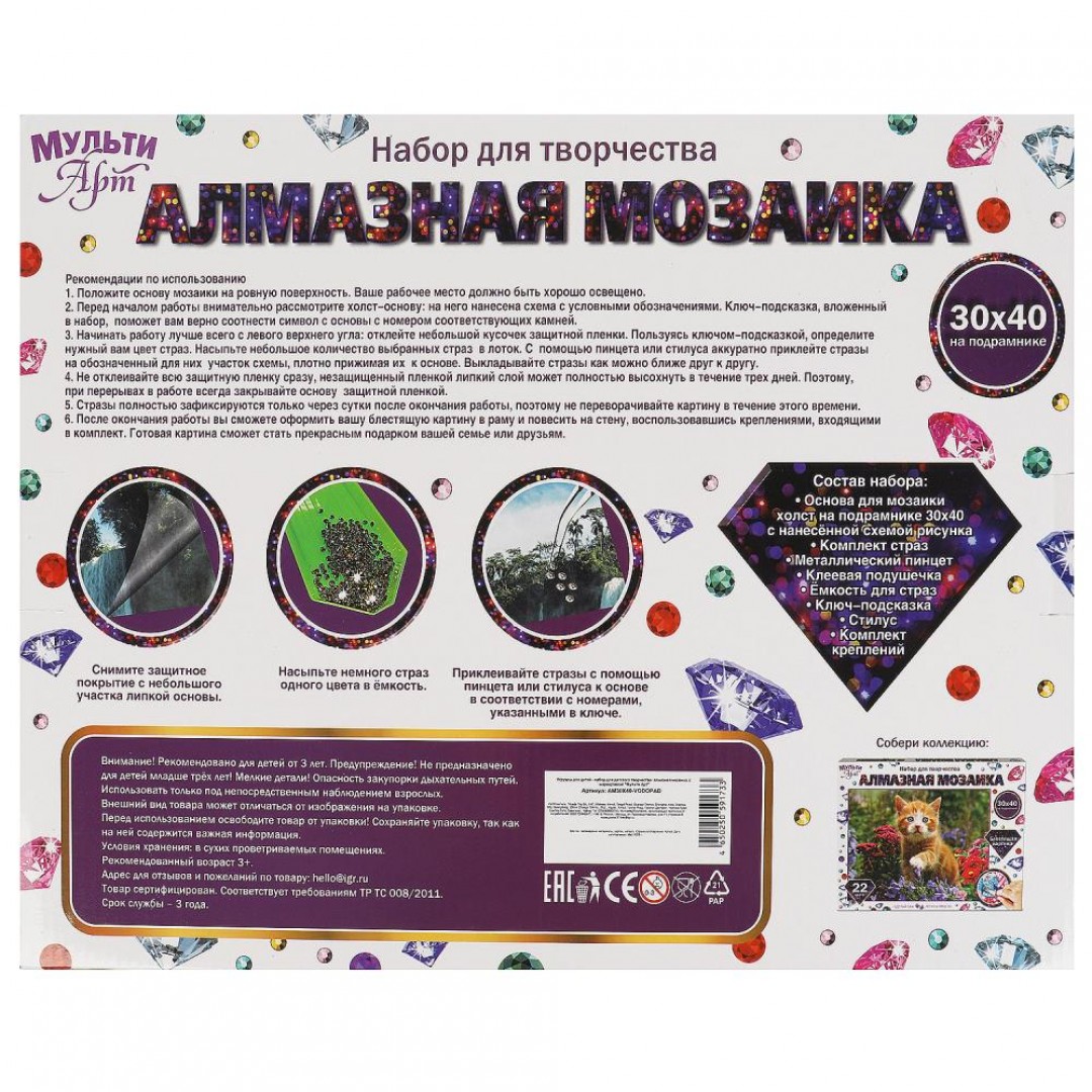 При помощи этого набора маленький художник сможет создать красивую картинку-мозаику, декорированную сверкающими стразами. Яркую блестящую поделку можно подарить близким или использовать для украшения комнаты.