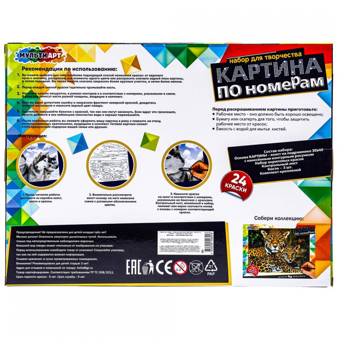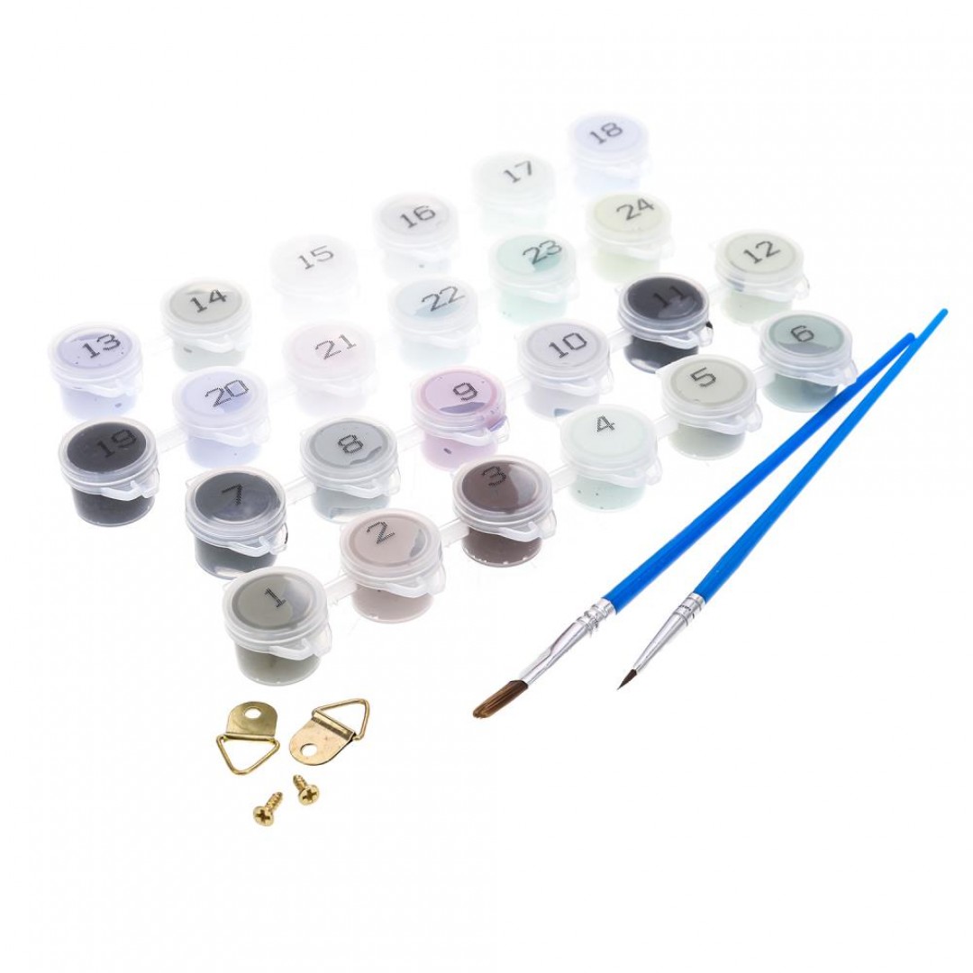 - всё необходимое в комплекте: холст на подрамнике 30 х 40 см, набор акриловых красок, 2 кисти, комплект креплений