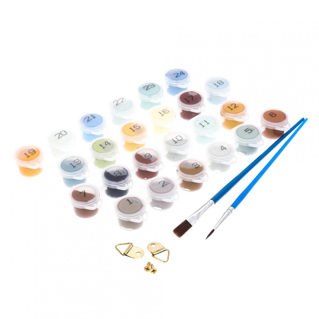 - всё необходимое в комплекте: холст на подрамнике 30 х 40 см, набор акриловых красок, 2 кисти, комплект креплений