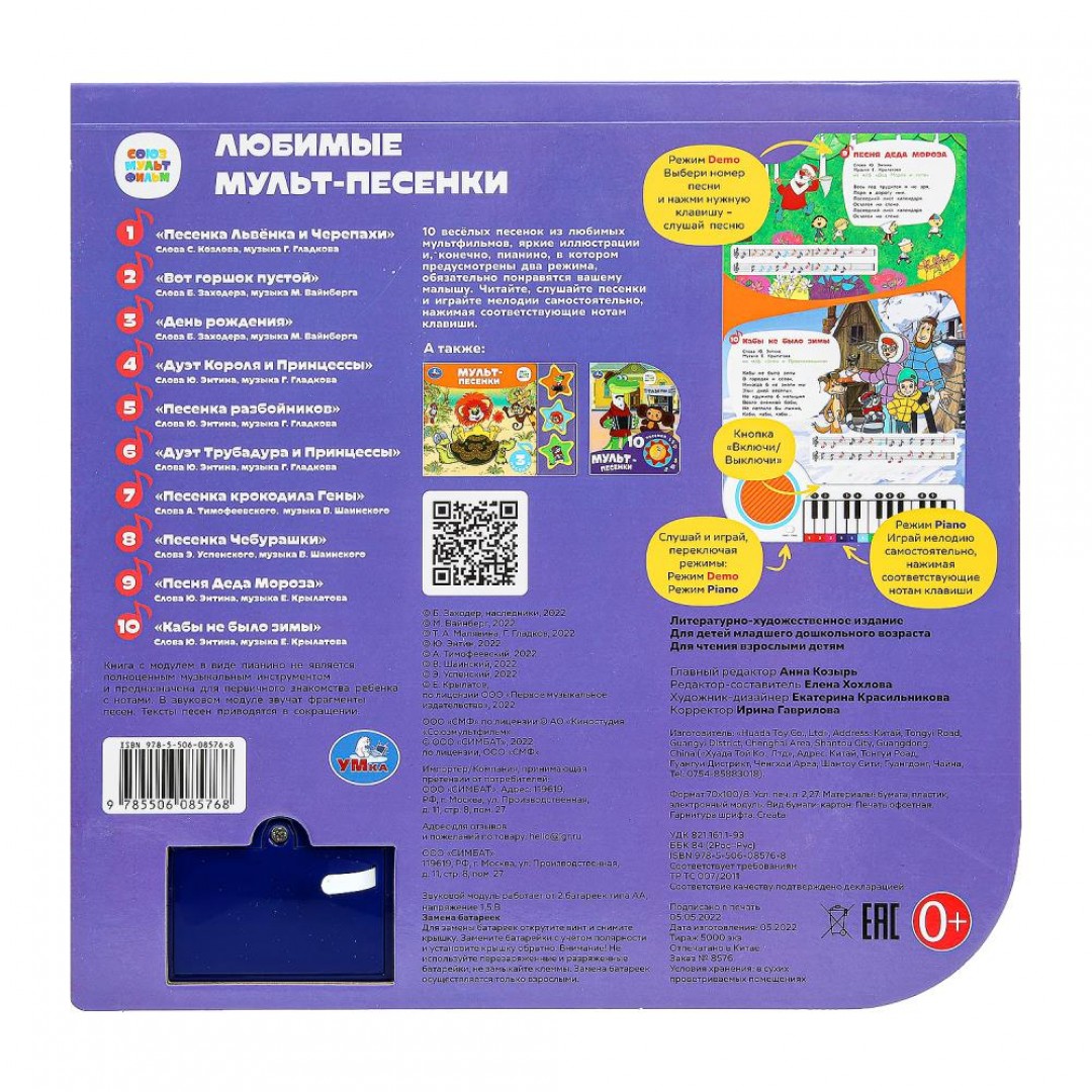 На каждой страничке это занимательной книги ребёнка ждут красивые иллюстрации, тексты песен из любимых м/ф и ноты к ним. При нажатии на кнопку слева от клавиш происходит переключение на режим проигрывания песен, при втором нажатии - переключение на пианино. В режиме пианино маленький музыкант, нажимая на клавиши, сможет наиграть по нотам-подсказкам песенки из книги или придумать свои собственные мелодии. Книга сделана из плотного картона, поэтому мамы могут не опасаться, что ребёнок порвёт странички.