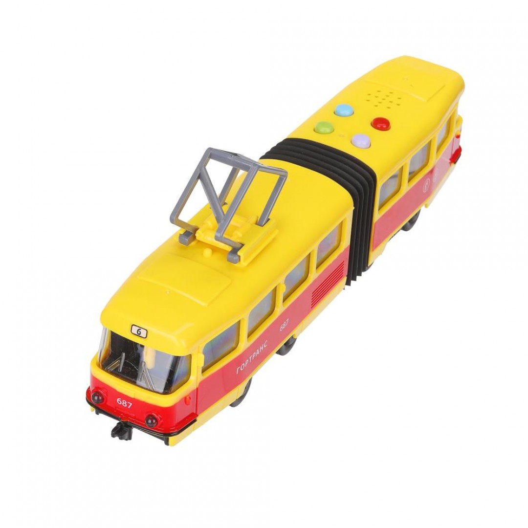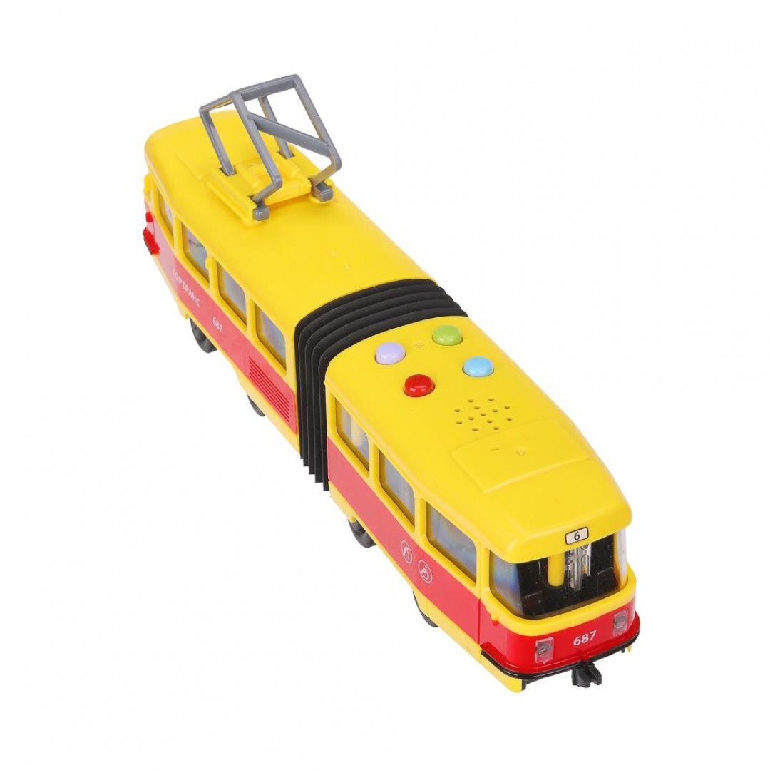 393562 Модель пластик свет-звук ТРАМВАЙ С РЕЗИНКОЙ 30см, 4кноп, двер, желт, кор. Технопарк в кор.2*18шт