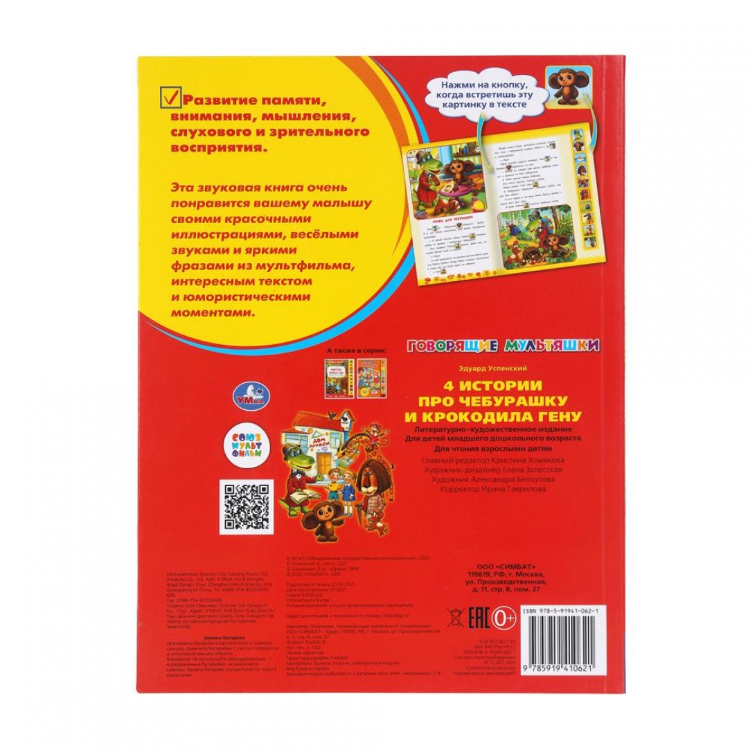Говорящая книга «Союзмультфильм. 4 истории про Чебурашку» ТМ «УМка» станет прекрасным подарком для маленького поклонника известного мультфильма: