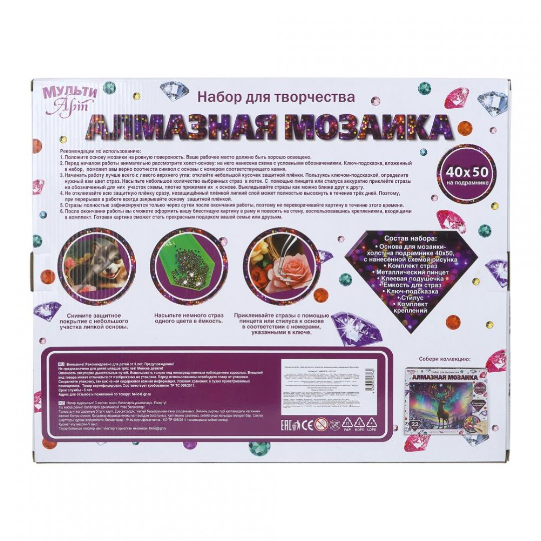 При помощи этого набора маленький художник сможет создать красивую картинку-мозаику, декорированную сверкающими стразами. Яркую блестящую поделку можно подарить близким или использовать для украшения комнаты.