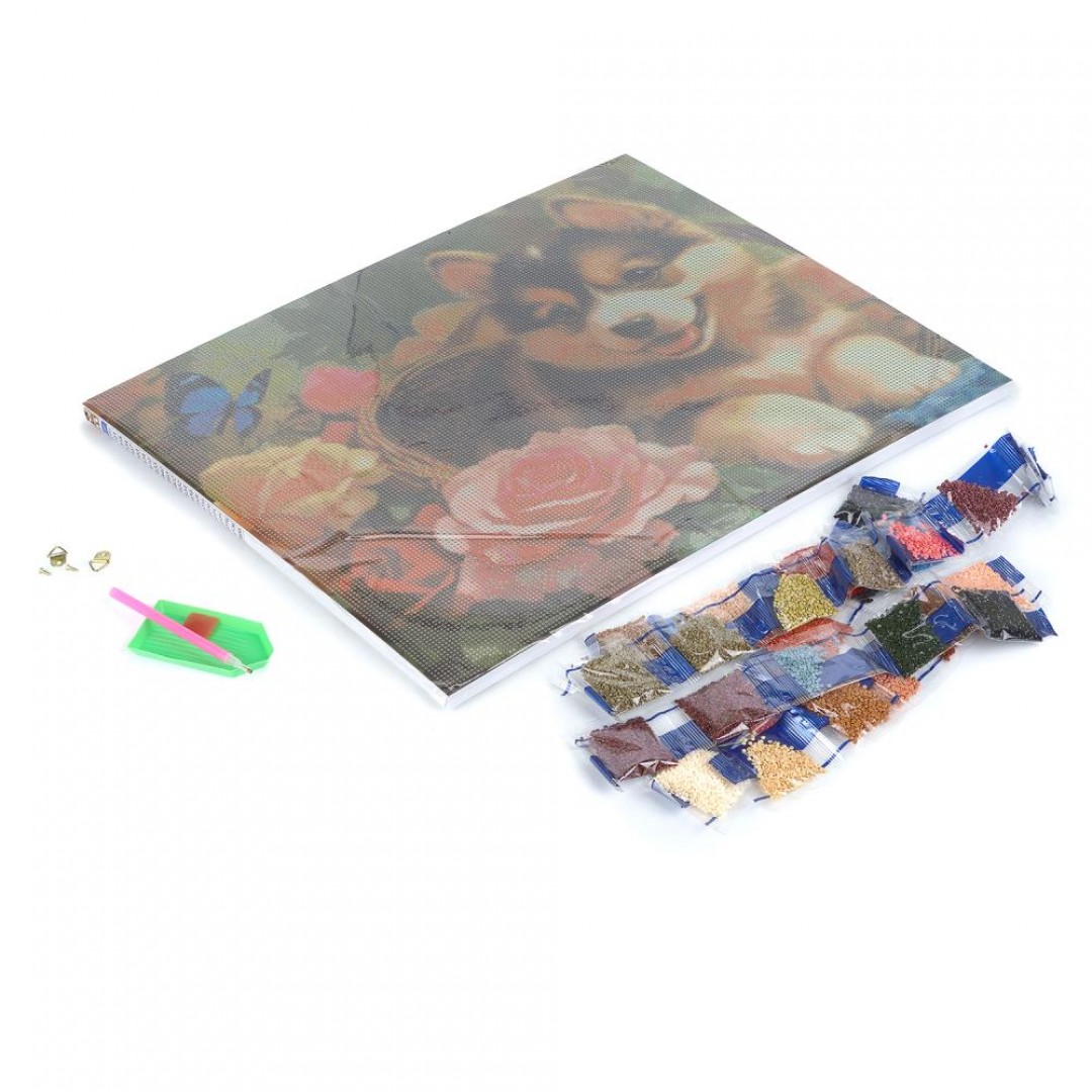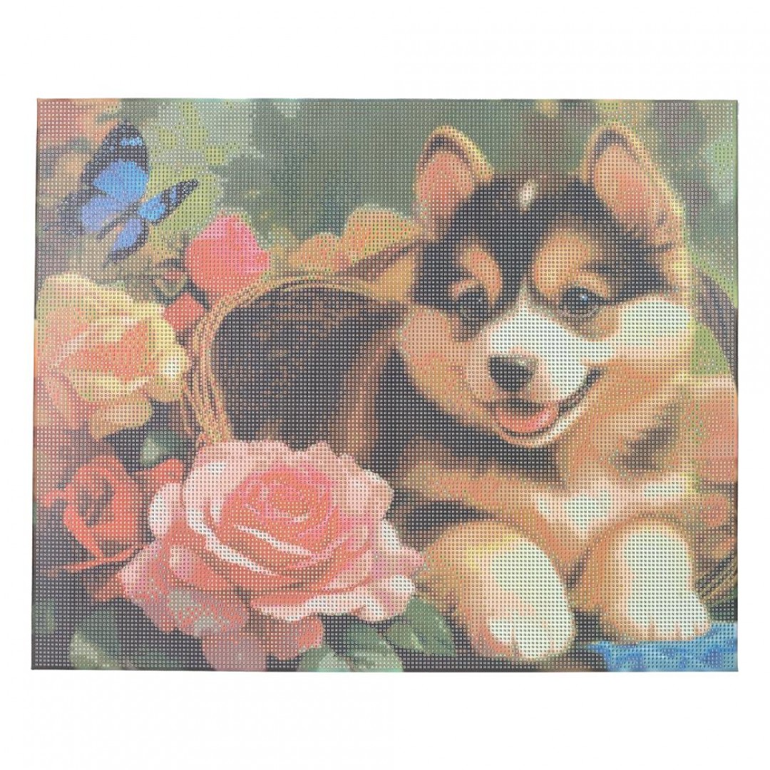 407332 Алмазная мозаика 40*50 щенок в корзинке с цветами MultiArt в кор.20шт