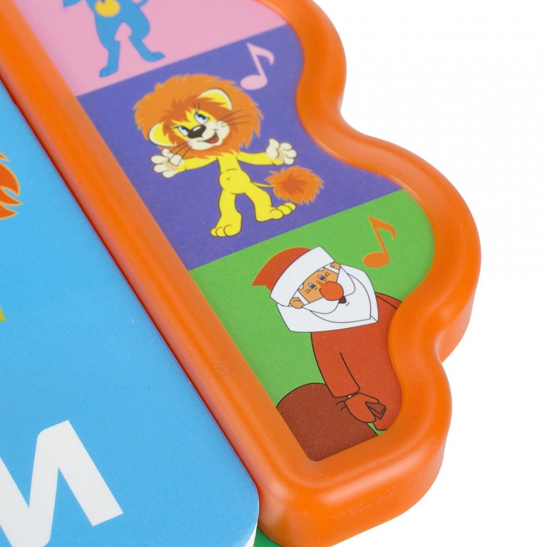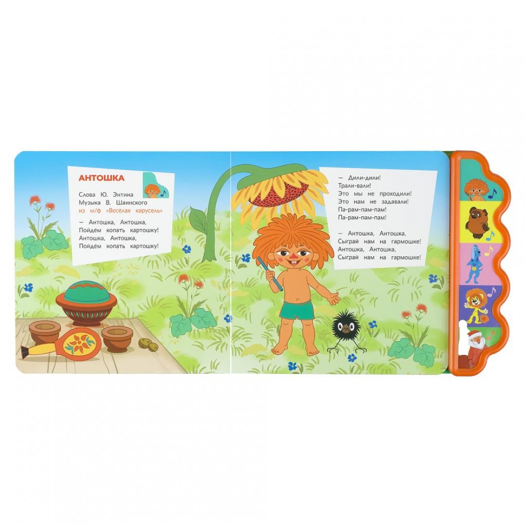 Малыш будет с удовольствием рассматривать яркие страницы, нажимать на кнопки и слушать песенки из любимых м/ф. Одно нажатие на кнопку – песенка включится, второе нажатие – выключится. Книга сделана из плотного картона, поэтому родители могут не опасаться, что ребёнок порвёт странички. Благодаря компактному формату её удобно брать с собой.