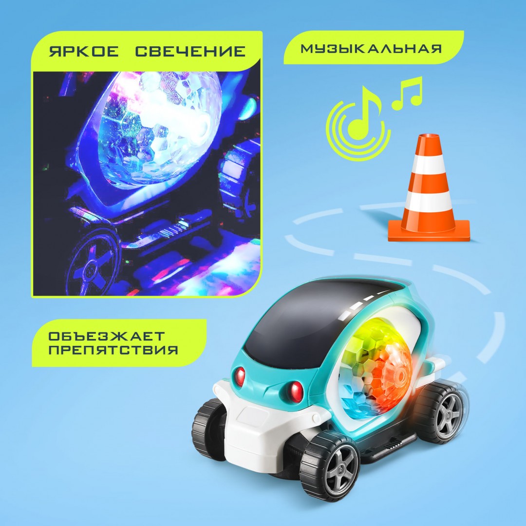 Малышу обязательно понравится такой подарок! Транспорт на батарейках с диско-шаром с лёгкостью объезжает встречающиеся препятствия и светится разными цветами.