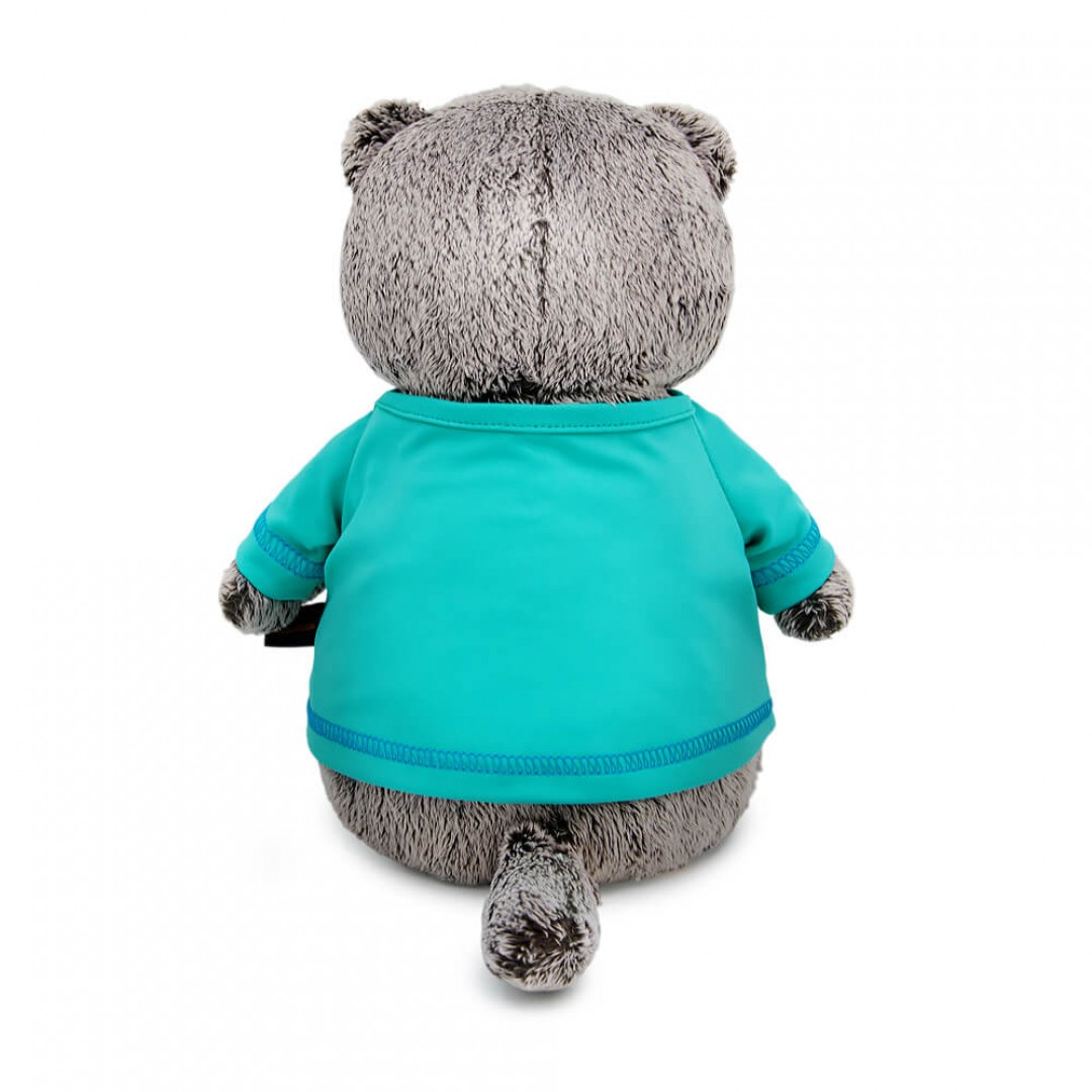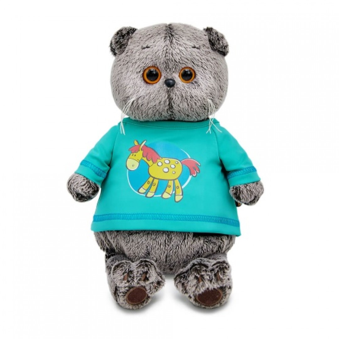 Кот Басик в мягком лонгсливе из х/б трикотажа цвета бирюзовой пастилы, с отделкой распошивочным швом синего цвета. Спереди на лонгсливе термонаклейка с авторским рисунком в виде трогательной жёлтой лошадки, символом года 2026.