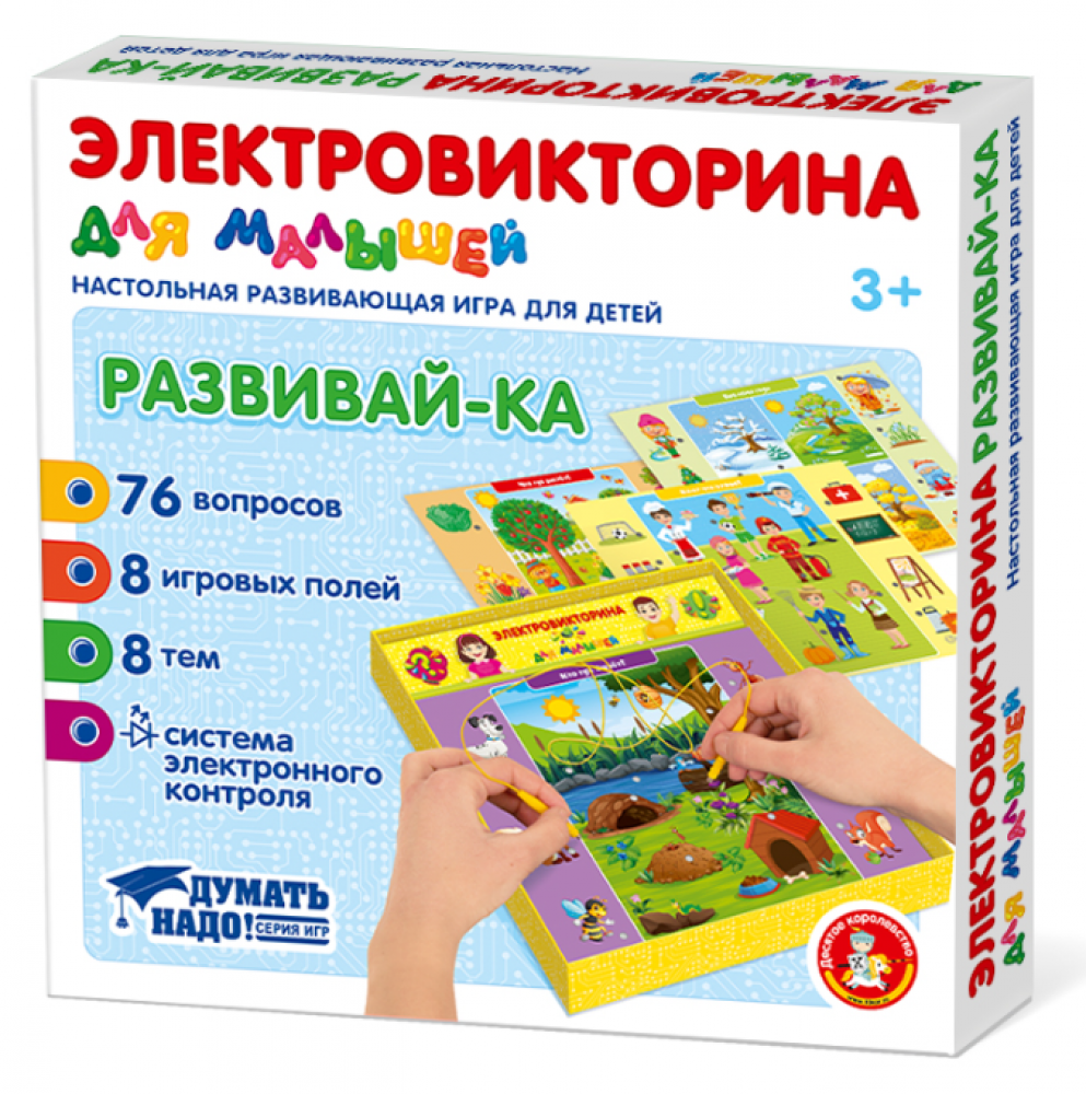 Электровикторина для детей "РАЗВИВАЙ-КА" в игровой форме учит малыша ориентироваться в окружающем мире и взаимодействовать с ним. Выполняя разнообразные и веселые задания, ребенок разовьет внимание, логическое и асоциативное мышление.