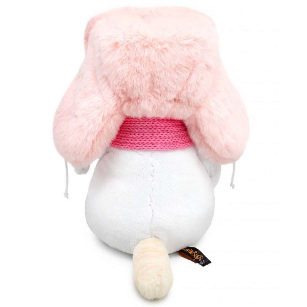Кошечка Ли-Ли в шикарной шапке ушанке из пушистого меха цвета розовой воды и вязаном розовом шарфе с белой полосой на концах.