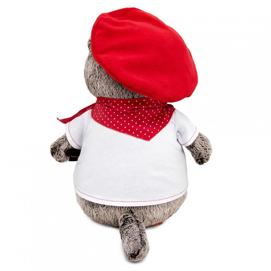 Кот в необычном, революционном комплекте. На Басике белоснежная футболка с оригинальным принтом и красной отстрочкой. Также в комплекте - алый флисовый берет на чёрном ободке.