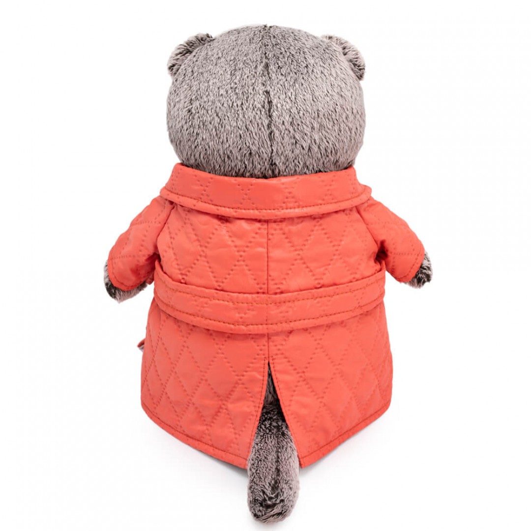 Кот в невероятно модном, стеганом пальто из болоньи тыквенного цвета. Пальто сшито двубортным, на бронзовых кнопках и с пояском. Также в комплекте небольшой галстук‑бабочка из репсовой ленты лесного зеленого цвета. Размер игрушки 30 см.