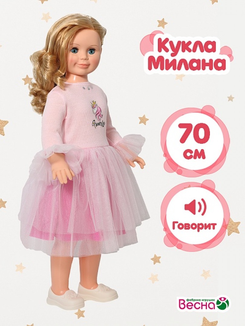 Высота куклы 70 см. Глаза вставные закрывающиеся. Тело куклы пропорционально и гармонично: ручки и голова выполнены из эластичного, приятного на ощупь винила, а туловище и ножки из пластмассы. Милана имеет длинные густые прошитые волосы из качественного нейлона, похожие на натуральные. Их можно завивать, расчёсывать, укладывать в разные причёски, меняя образ куклы, что даёт возможность ребёнку развивать эстетический вкус.