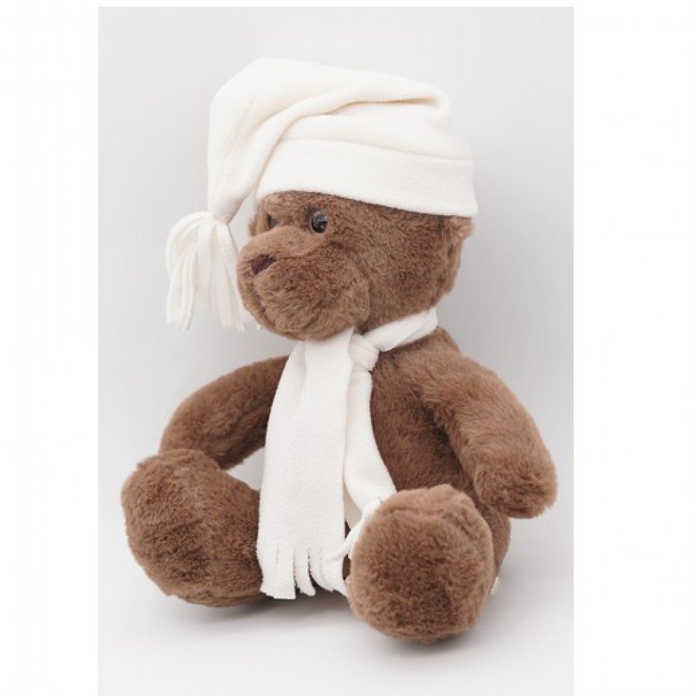 Мягкая игрушка Мишка Аха "Шоколад", в белых флисовом шарфе и колпаке с кисточкой. Размер: 24x14x12 см.