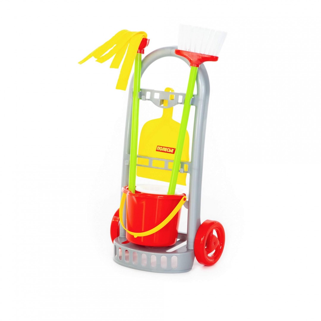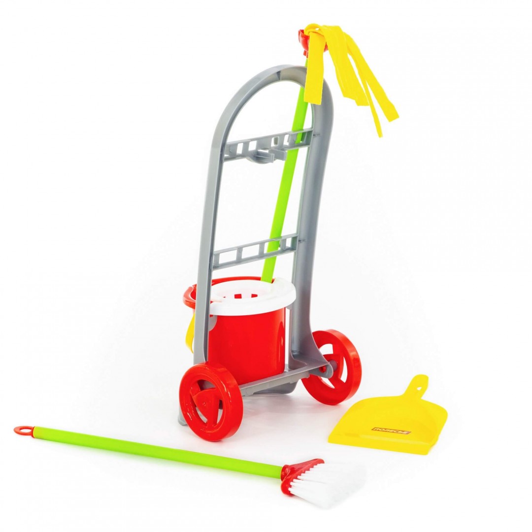 В наборе на тележке ведерко с отжимом, швабра, щетка и совок.