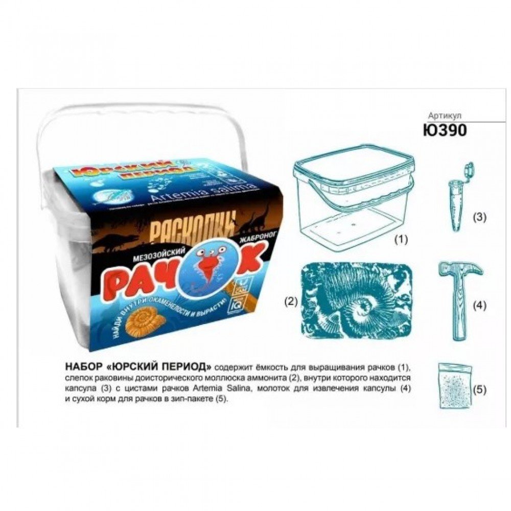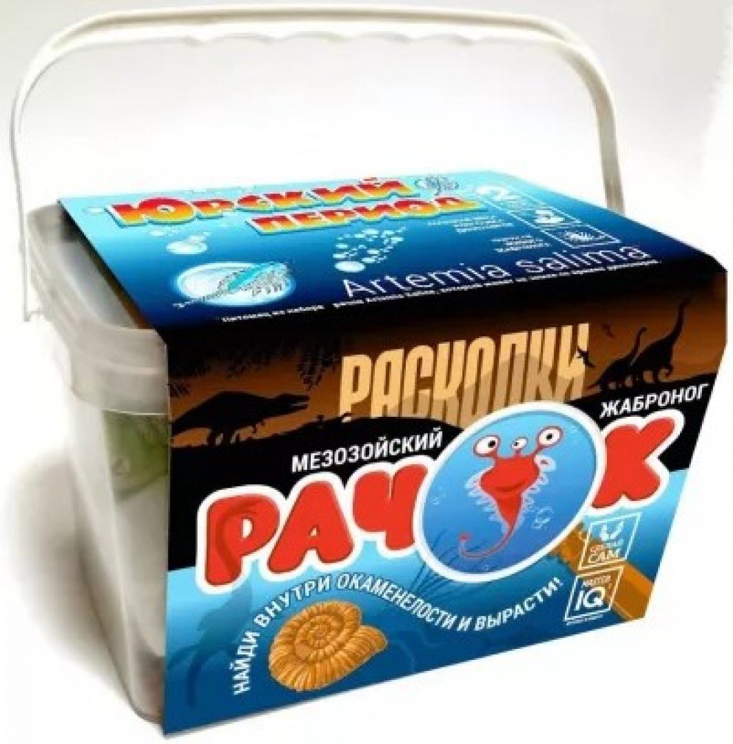 Представьте, что вы нашли древнюю окаменелую раковину, в которой сохранились живые яйца ровесников динозавров. Раскопайте их и вырастите доисторических питомцев! Набор «Юрский период» содержит слепок раковины ископаемого моллюска аммонита, внутри которого находится капсула с яйцами рачков Artemia Salina, живущих на Земле более 150 млн лет, молоток для извлечения капсулы, сухой корм и ёмкость для выращивания артемий. Следуйте инструкции, и ваши рачки вырастут до максимального размера (10-15 мм) в течение 30-40 дней. При правильном уходе они смогут отложить яйца, и у вас вылупится второе поколение артемий.