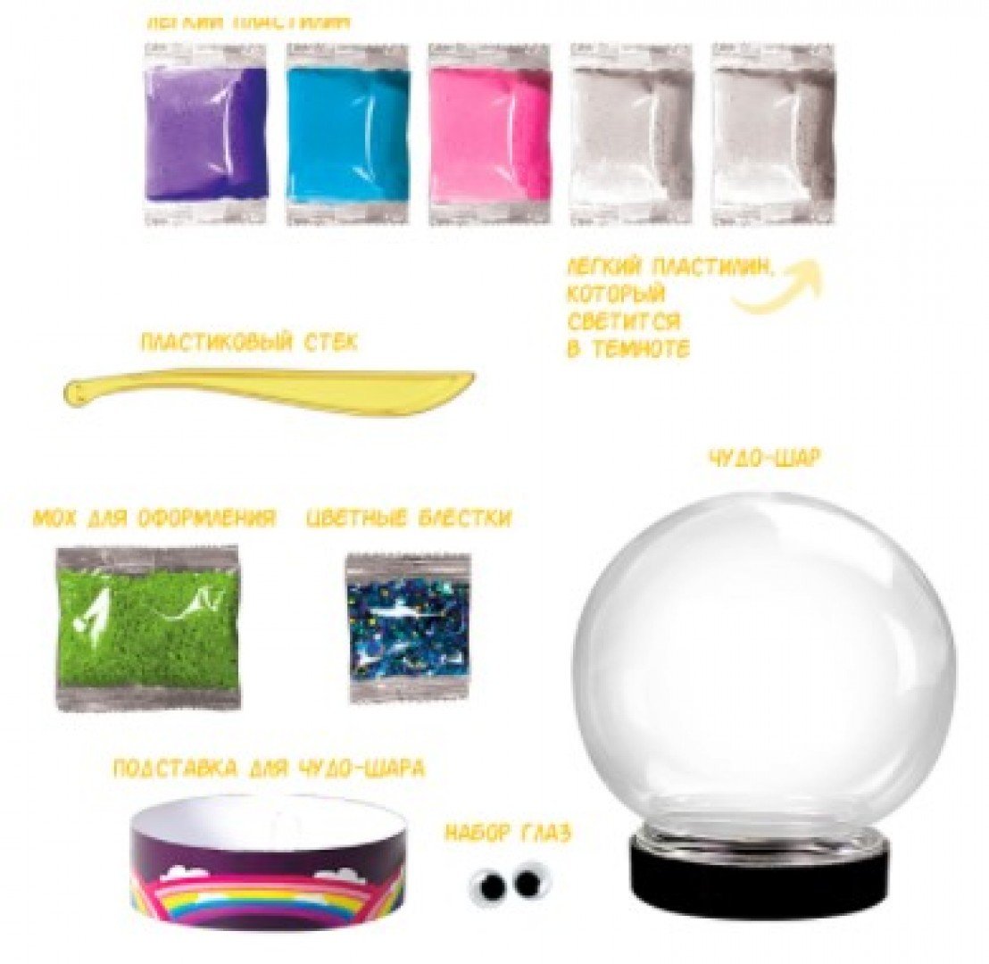 Создай сувенир-подарок своими руками! Содержит простую пошаговую инструкцию для сборки - справится любой ребенок. Внимание - фигурка единорога будет светится в темноте! А голографические блестки придадут шару волшебное мерцание даже при дневном свете! В набор входят: легкий пластилин (несколько цветов) для создания единорога, блестки и декоративный мох для украшения, красочная подставка под чудо-шар, глазки для фигурки, стек.