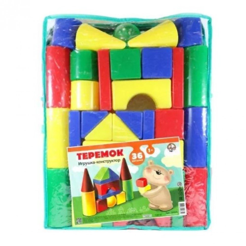 Набор «Теремок» включает 36 элементов из выдувной пластмассы. Он помещен в долговечную и прочную ПВХ сумку с замком, что очень удобно для хранения, транспортировки и поддержания порядка в детской комнате.