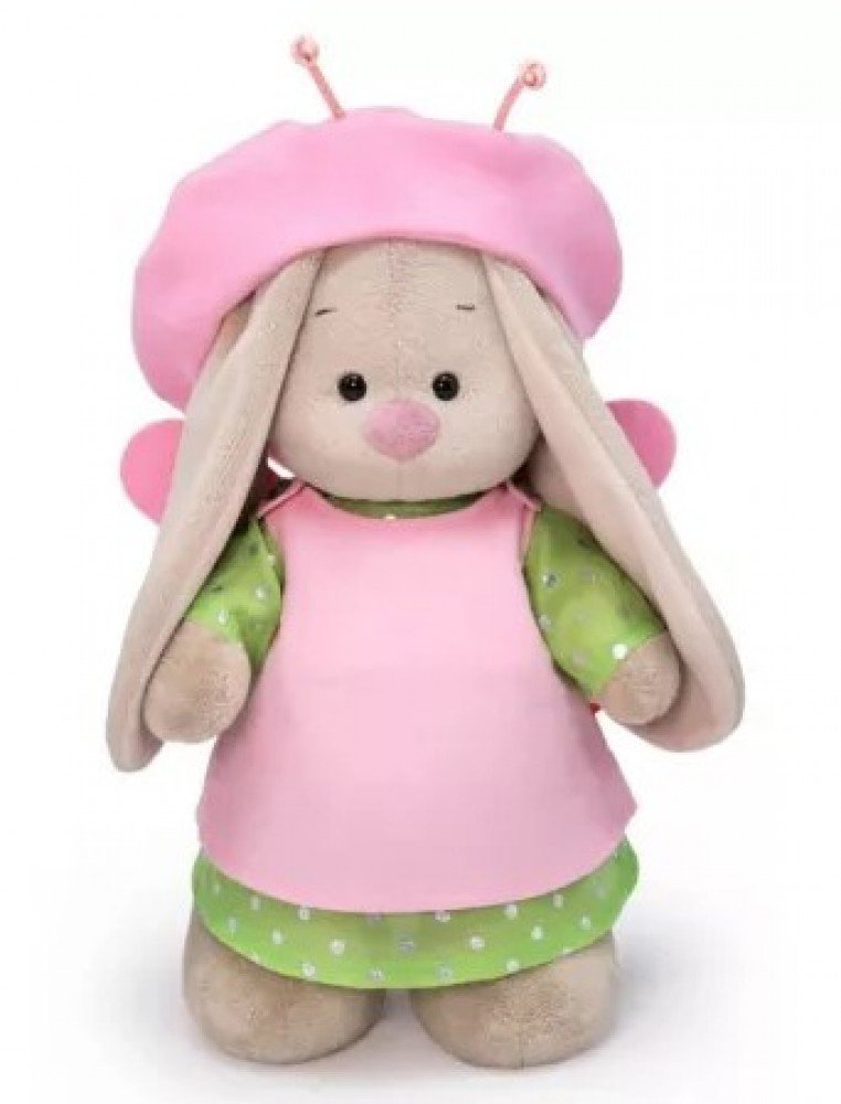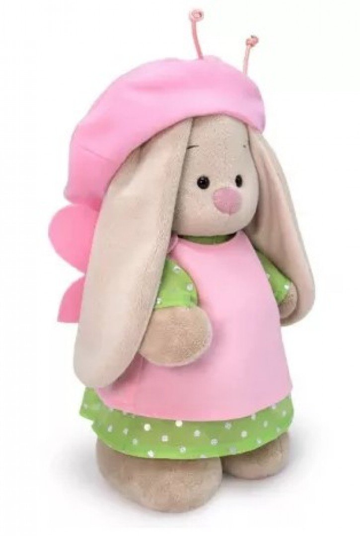 Зайка Ми в очаровательном костюме «Бабочка». Нежно‑зеленое хлопчатобумажное платьице в серебристый горошек, поверх платья хлопковый сарафанчик цвета розовой карамели со вшитыми розовыми крылышками из фетра. Также в комплекте мягкий розовый берет с усиками из шелковистого шнурочка. Игрушка поставляется в оригинальной подарочной упаковке.