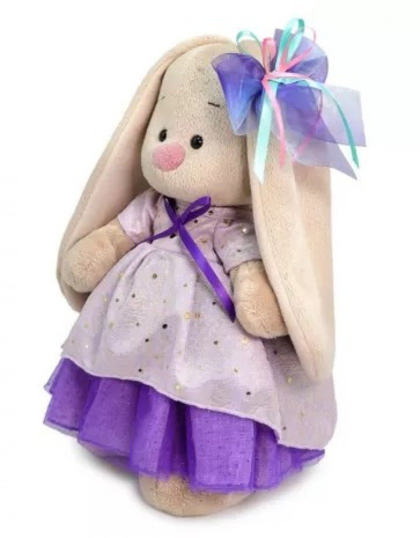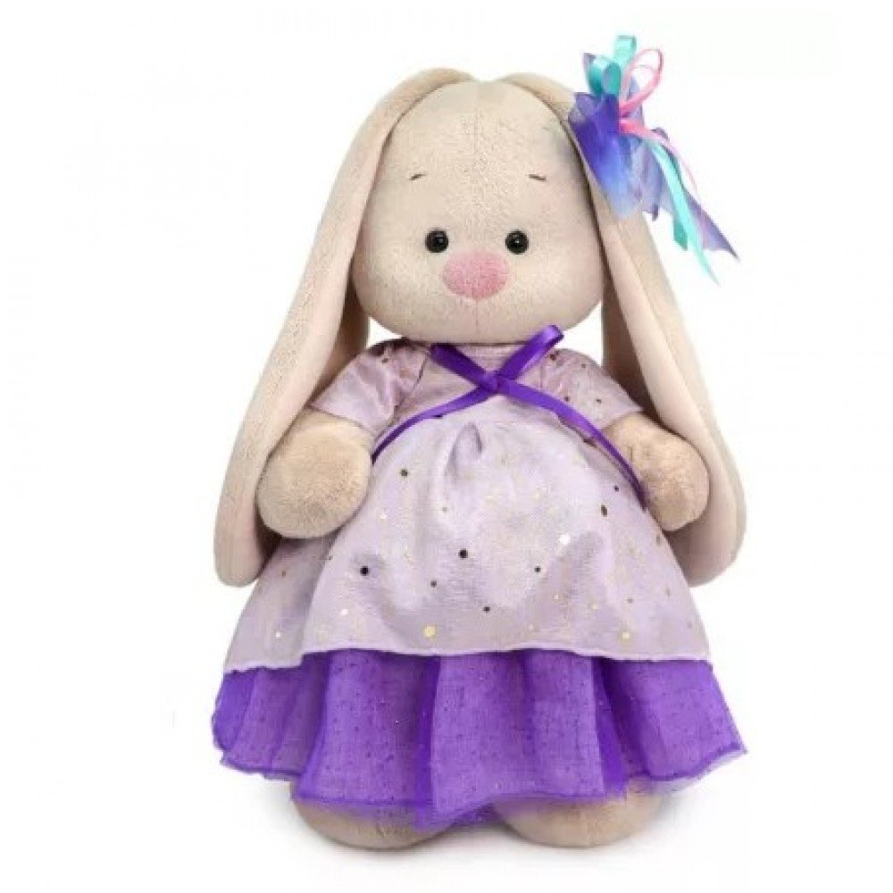 Зайка Ми в нарядном платье из сиреневого трикотажа с золотистым блеском и золотыми пайетками. Нижняя юбка выполнена из фиолетовой марлевки и сеточки с блеском. Спереди платье украшает бантик из атласной фиолетовой ленты. На ушке у Зайки ручной работы составной бант из цветных лент. Игрушка поставляется в оригинальной подарочной упаковке.